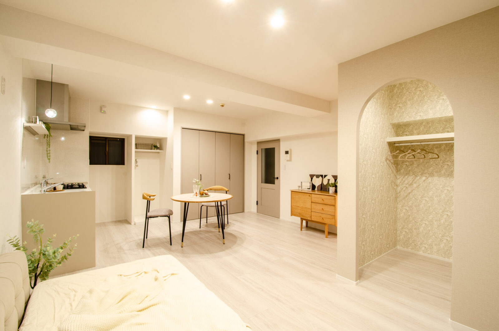 美意識と効率が調和する、大人の隠れ家。 薬院2丁目・駅徒歩2分。3DKを「14.3帖の大空間」へフルリノベーション。 地下鉄七隈線「薬院大通」駅まで徒歩2分。利便性の高い人気エリアに、FUKUKURAが手掛けるリノベーション物件が誕生しました(2025年12月完成)。 テーマは「ホテルライクスタイル」。細切れだった3DKを、約14.3帖の開放的なワンルームへ大胆に変更。 内装はポタリーベージュとホワイトオークで統一し、気品ある空間に仕上げました。 生活感を隠すウォークインクローゼット(WIC)や、パナソニック製の最新水回り設備を採用。