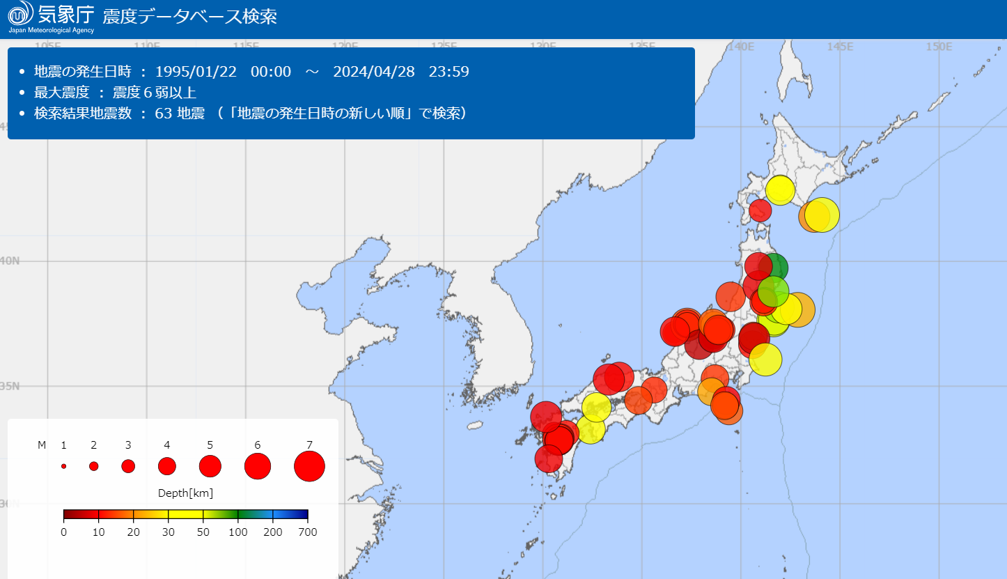 阪神淡路大震災(1995年)以降、震度6弱以上の地震が全国で60回も発生。