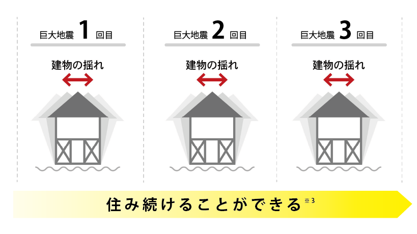 ※3 住み続けることができるとは、地震による建物の最大層間変形角が1/45rad未満であることと定義しています。居住のために、建物内外において一部補修が必要になる場合があります。