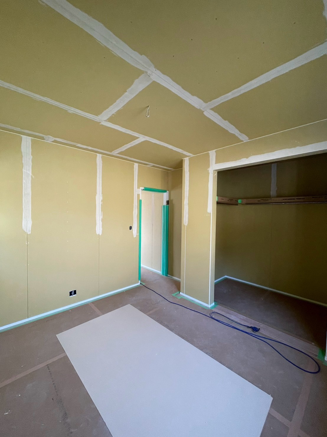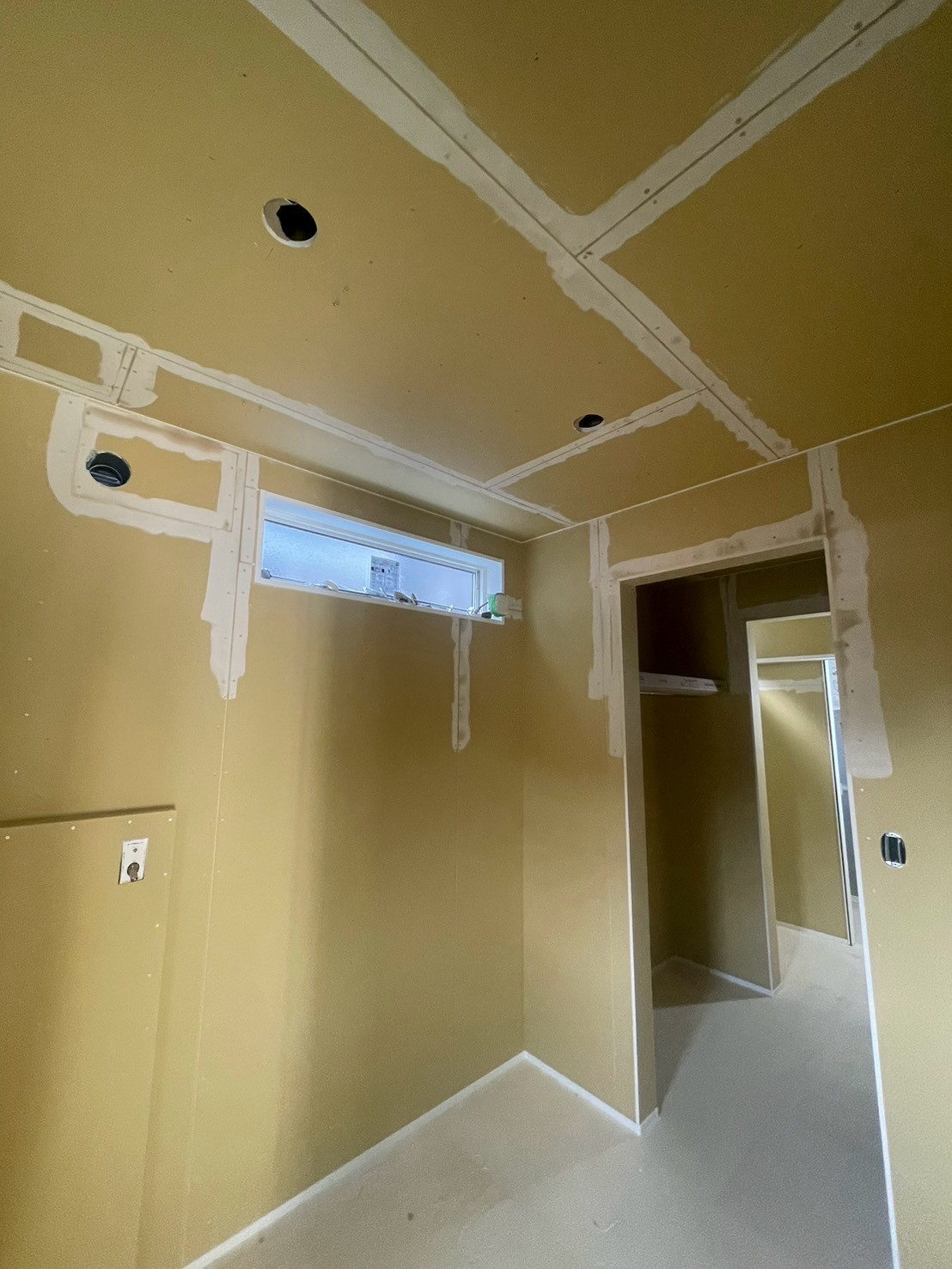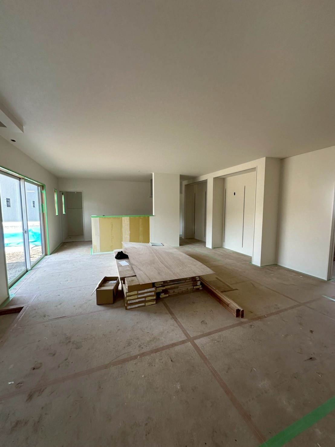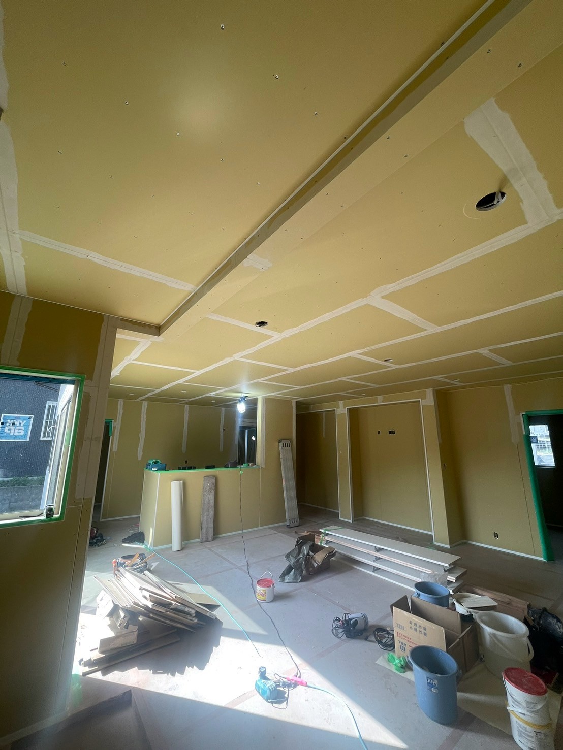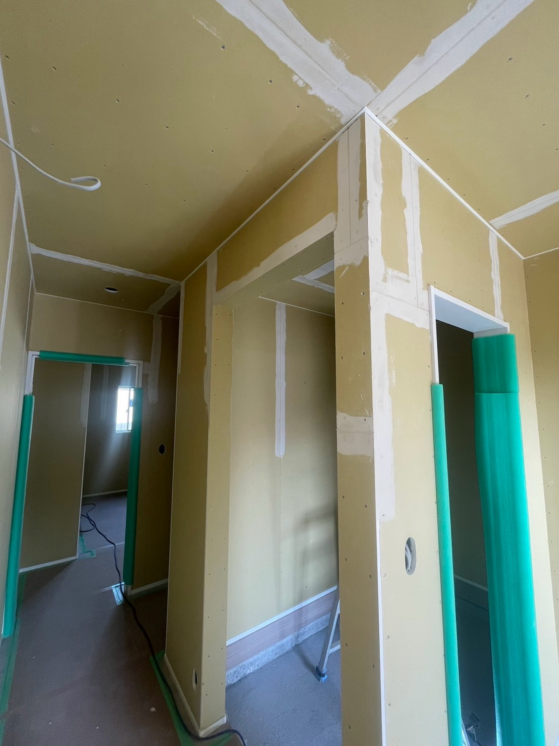 石膏ボードが張り終わると、クロスを貼る前に下地処理としてパテ埋めを行います。ボードの継ぎ目やビスの跡などを丁寧に埋めて、平らで美しい下地を作ることが、クロスの仕上がりを左右する大切な工程なんです。職人さんの丁寧な作業には、いつも頭が下がります!