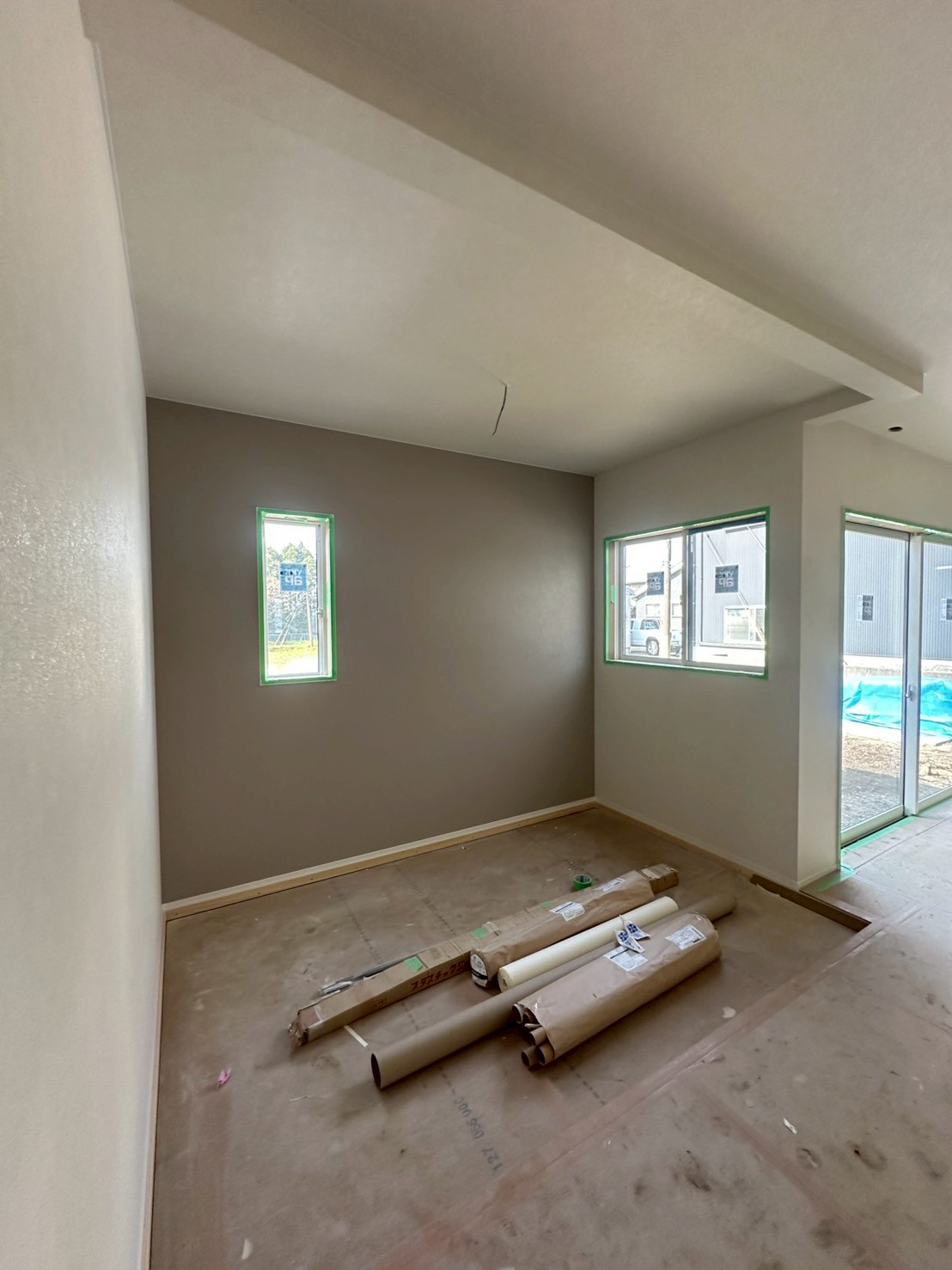 パテ埋めが終わると、いよいよクロスの貼り付けです!白いクロスが貼られていくと、お部屋の印象がガラッと変わりますね!今回はどんなクロスが選ばれたのか、ぜひ完成したモデルハウスでチェックしてみてください♪
