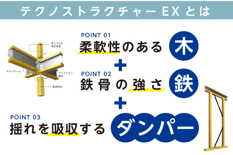 木のやさしさに、鉄の強さをプラス。テクノストラクチャーは、鉄を芯にしたテクノビームで梁の強度と信頼性を高め、接合部にも専用金具やドリフトピンを用いて耐震性を強化。さらに、地震の揺れを抑える「テクノダンパー」が繰り返す地震から住まいを守ります。