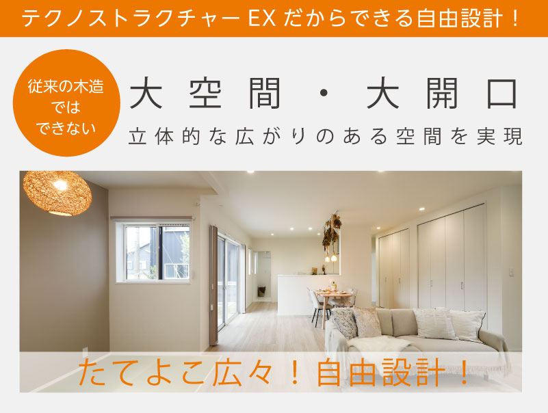 地震に強い構造だからできる、従来の木造建築ではできない「大空間・大開口」の立体的な広がりのある空間を実現!