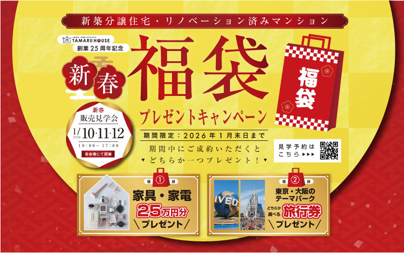 2026年1月10日㈯11㈰12㈷田丸ハウス新年初めてのイベント!新築分譲住宅も、リノベーション済みマンションも。この新春、田丸ハウスが自信をもってお届けする住まいを実際に見て、比べて、体感できる販売見学会を開催します。期間中にご成約いただいた方には「家具・家電25万円分」または「東京・大阪のテーマパーク旅行券」をプレゼント。新年のスタートにふさわしい「住まいの福袋」です。間取りの使いやすさ、デザインの心地よさ、そして価格や立地まで。写真や図面だけではわからない「暮らしのリアル」をぜひ現地で確かめてください。2026年、住まい選びに「福」を。皆さまのご来場を心よりお待ちしております。