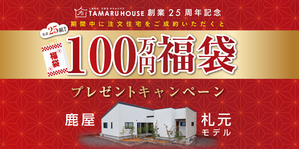 創業25周年の感謝を込めて、田丸ハウスから新春だけの特別企画。期間中に注文住宅をご成約いただいた先着25組様へ「選べる100万円分の福袋」をプレゼントします。太陽光パネル、カーポート、カーテン・照明、家具・家電暮らしを一気にアップデートできる4つの福袋からお好みでお選びいただけます。1/10・11・12は札元モデルにて新春住宅相談会を開催。家づくりの疑問や資金計画、土地のことまで、気軽にご相談ください。このチャンスは期間限定(〜2026年3月末)。新しい一年、理想の住まいを賢くはじめませんか。