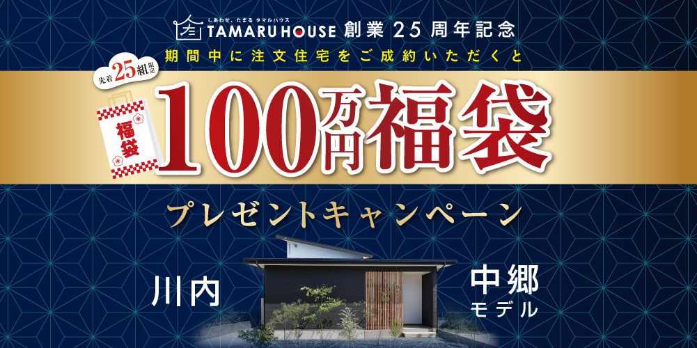 創業25周年の感謝を込めて、田丸ハウスから新春だけの特別企画。期間中に注文住宅をご成約いただいた先着25組様へ「選べる100万円分の福袋」をプレゼントします。太陽光パネル、カーポート、カーテン・照明、家具・家電暮らしを一気にアップデートできる4つの福袋からお好みでお選びいただけます。1/10・11・12は中郷モデルにて新春住宅相談会を開催。家づくりの疑問や資金計画、土地のことまで、気軽にご相談ください。このチャンスは期間限定(〜2026年3月末)。新しい一年、理想の住まいを賢くはじめませんか。