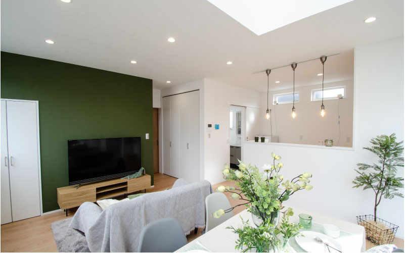 買い物後の荷物が高さと光が広がる開放的なLDK。家族が自然と集まる心地よさを生む、大空間リビングです。スムーズに片づき、散らかりにくい動線設計。