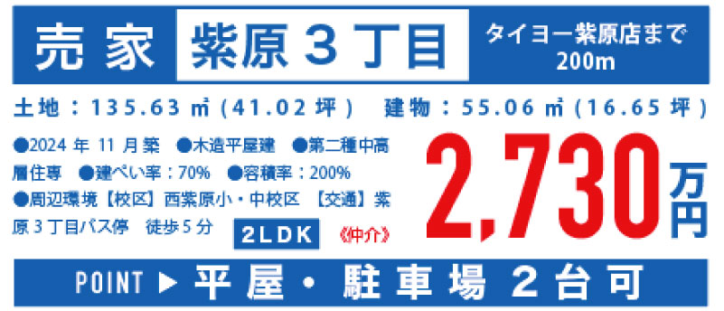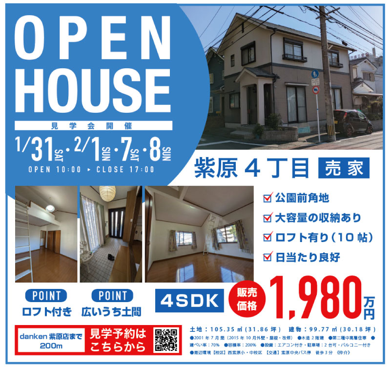 1月31日・2月1日・7日・8日は、紫原4丁目で売家の見学会開催!紫原4丁目の公園前角地という恵まれた立地に、ロフト付きで収納豊富・日当たり良好、駐車2台可能な4SDKの住まいを1,980万円で実際に体感できるオープンハウスを開催中で、写真や図面では伝わらない“広さ・明るさ・暮らしやすさ”をその場で確かめていただけます。