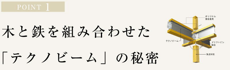 木材の芯に鉄骨を組み込んだ複合梁「テクノビーム」は、木のしなやかさと鉄の粘り強さを両立した独自構造。純木造では実現できない強度を生み出します。
