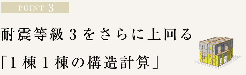 最高基準の耐震等級3のさらに1.75倍の地震力で強度を確認。あなたの間取りで388項目を計算し、結果はパナソニックが保証書として発行します。「強い」という言葉でなく、数字と書面で証明された安心を持って暮らせます。