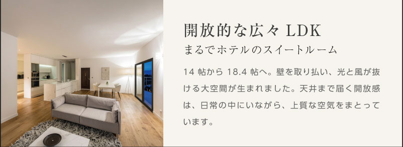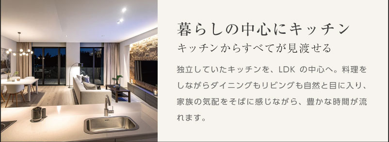 独立していたキッチンを空間の中心へ移し、LDKは18.4帖の広がりへ。光と視線が抜けるその空間は、静かで凛とした上質な空気をまとっています。建築家が設計したこだわりの空間構成。素材、設計、細部にいたるまで、妥協なく選び抜きました。帰るたびに、ここでの暮らしを誇りに思える。ここから始まる暮らしをぜひ体感してください。